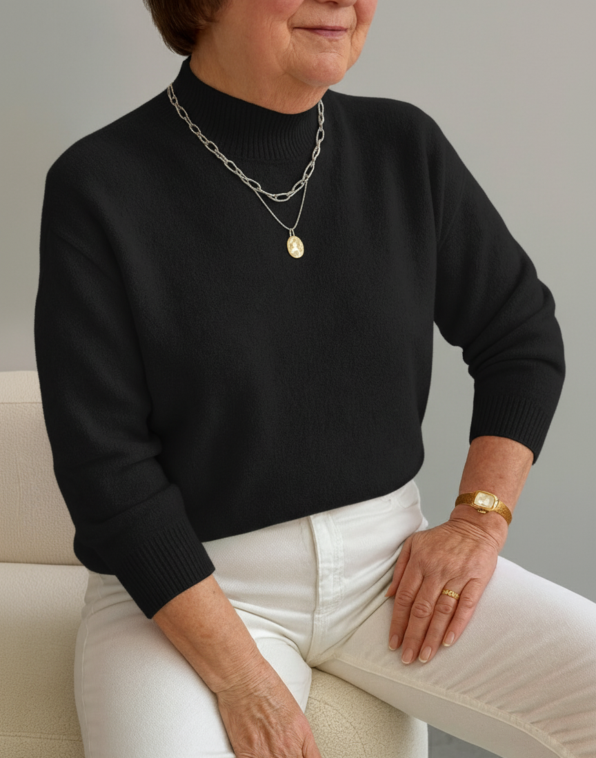 The gentle knit fabric feels soft against the skin, while the high neckline and refined details add a touch of modern sophistication. Whether you're dressing up for lunch or enjoying a quiet day at home, the Cyranda Sweater wraps you in warmth with effortless grace.